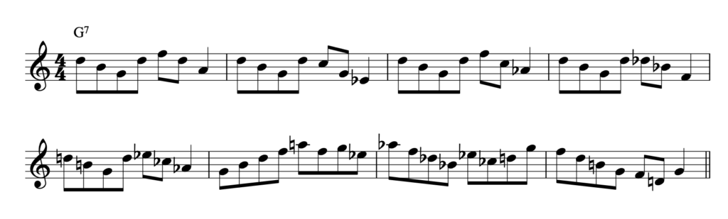 In the first measure the G7 is presented as a triad in the first two beats, then the 7th (F, falling on beat three) is grouped with D and A to form a D minor triad. The second measure starts the same, but ends with a C minor triad. The third measure adds an F minor triad; the fourth measure adds a Bb minor triad; the fifth measure adds an Ab minor triad. In the sixth and seventh measure I combine elements from all the triads to create a melodic line with lots of harmonic tensions, ending with a restatement of the G7 arpeggio.